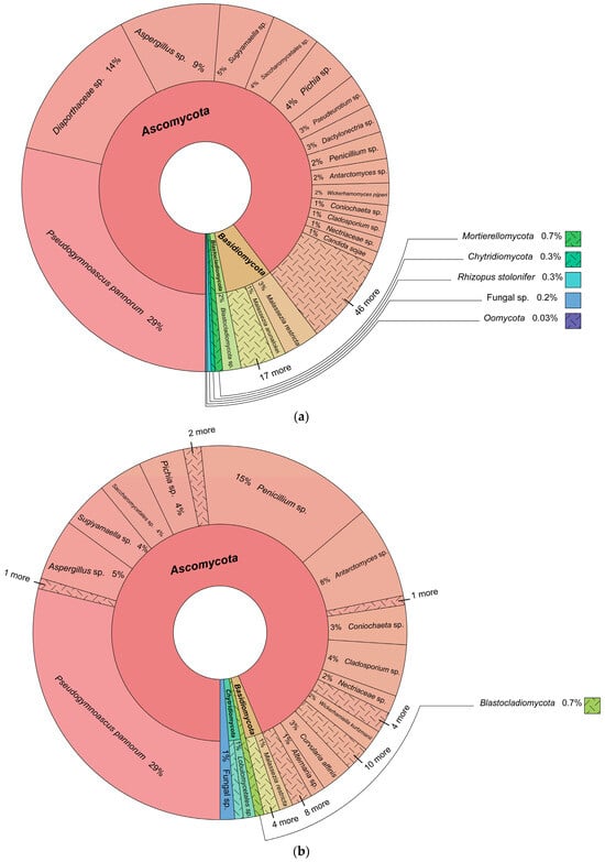 In a study carried out in a polar desert region of continental Antarctica, rocks were analysed using DNA metabarcoding, reporting 262,268 fungal DNA reads grouped into 517 fungal ASVs dominated by the phyla Ascomycota, Basidiomycota, Mortierellomycota, and Mucoromycota, in abundance order [17]. These results showed similarity to those obtained in our study [55,56,57], in which Ascomycota and Basidiomycota represented the dominant phyla, with Mortierellomycota and Mucoromycota as minor components. However, in the current study, we detected taxa from further phyla including Chytridiomycota, Rozellomycota, Blastocladiomycota, Monoblepharomycota, Zoopagomycota, Aphelidiomycota, and the fungal-like Oomycota (Stramenopila). The dominant genera detected in the current study (Pseudogymnoascus, Penicillium, Aspergillus, and Cladosporium) were similar to those reported in [17].