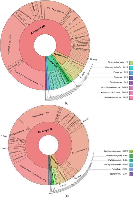 A total of 940,969 fungal DNA reads were obtained, which were assigned to 198 amplicon sequence variants (ASVs) (Figure 3, Supplementary Table S1). Ascomycota was the dominant phylum, followed by Basidiomycota, Mortierellomycota, Chytridiomycota, Mucoromycota, Rozellomycota, Blastocladiomycota, Monoblepharomycota, Zoopagomycota, Aphelidiomycota (Fungi) and the fungal-like Oomycota (Stramenopila), in rank order (Supplementary Figure S1). Pseudogymnoascus pannorum, Penicillium sp., Aspergillus sp., Cladosporium sp., Aspergillaceae sp. and Diaporthaceae sp. were the most abundant taxa (relative abundance ≥ 10%). In addition, 22 fungal ASVs displayed intermediate abundance, and 170 formed minor components of the assigned fungal community.