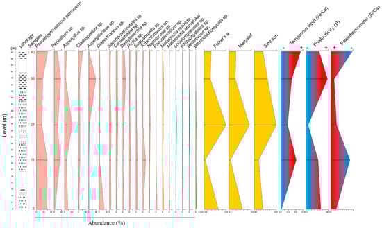 Comparison across the lithology of the most abundant fungal taxa, diversity indices, terrigenous input (Fe/Ca), productivity (P) and paleothermometer (Sr/Ca) data detected in samples 2, 11, 21, 36 and 40.