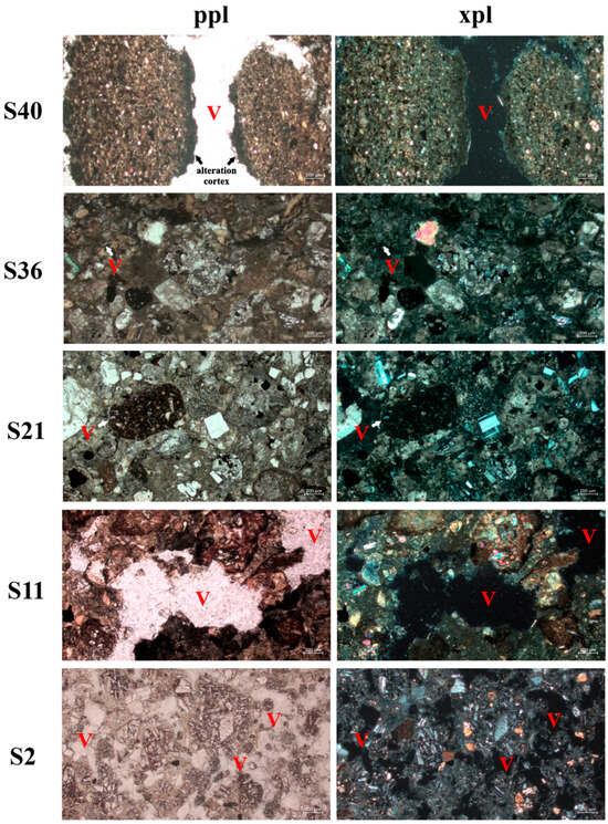 Petrographic microscope photomicrographs in plane polarized light (ppl) and crossed polarized light (xpl) of the samples in section LR-1. V = voids.
