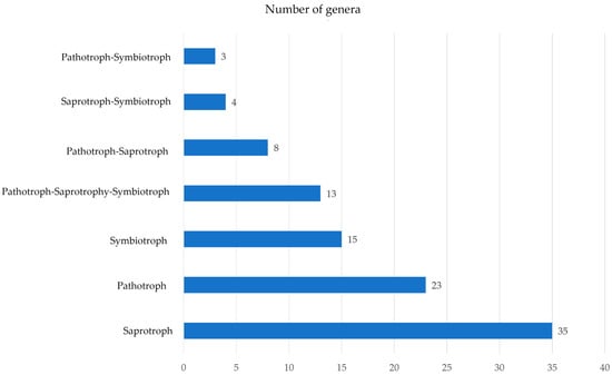 The 101 fungal ASVs genera detected were assigned to fungal lifestyles using FunGuild (Supplementary Table S2). The majority of assignments were to saprotrophic, pathogenic, and symbiotic taxa, with some displaying multiple ecological roles (Figure 8). The fungal genera included animal and plant pathogens, soil, wood, litter and undefined saprophytic taxa, endophytes, and lichenized fungi. Considering only ASVs classified to a single ecological status (Figure 9), in four of the samples saprophytic taxa dominated, followed by pathogenic and symbiotic taxa, while, in sample S40, symbiotic taxa were more diverse than pathogenic taxa.