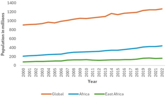 According to [24], the global goat population has shown a steady increase to the current estimate of over 1269 million goats in 2022 from 907 million in 2000. The overall goat population for the African region has also shown an increasing trend, which reached its highest point in 2022. Africa accounts for approximately 34% (440 million) of the global goat population, while East Africa accounts for 36.6% (161 million) of the total goat population in Africa (Figure 2).