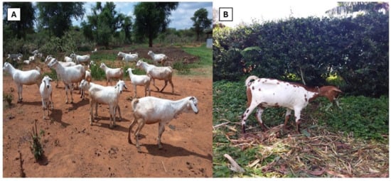 This system allows animals to graze freely on rangelands, fields of harvested crops, woodlands, and even the sides of roads. Sometimes, a shepherd keeps watch over them as they browse on shrubs. This extensive production system encourages the unrestricted movement of goats, enabling communal intermingling during herding which can lead to disease outbreaks [60,61]. Goats are often deprived of permanent night shelter; this exposes them to outdoor sleeping conditions thus compromising their welfare. In addition, it is difficult to understand the extent to which the animals in this production system have met their daily nutritional requirements through their dietary intake, as their grazing behavior on grasslands, residual crop materials, and sporadic browsing on shrubs with no supplementation cannot be assessed, which ultimately contributes to low productivity in these breeds [62].