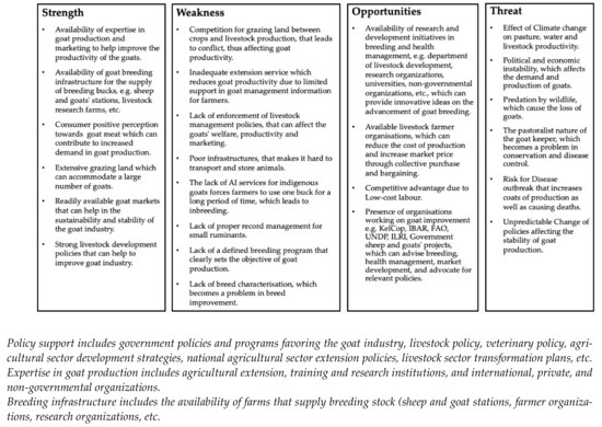 For this reason, it is advisable to do a deeper investigation into the challenges faced by these production systems and come up with breeding goals that will ensure the development of a sustainable genetic improvement program and safeguard the genetic resources of indigenous goats in East Africa [69]. To address this challenge, there is a need to address the activities that will ensure sustainable land and resource management practices, improved infrastructure, access to agricultural education and veterinary services, and develop and enforce the favorable policies that can support the resilience and adaptation of pastoral and agro-pastoral communities to changing conditions and develop a breeding program that will improve important traits such as production, functional traits, and disease resistance. Figure 4 shows the SWOT analysis of indigenous goats in East Africa.