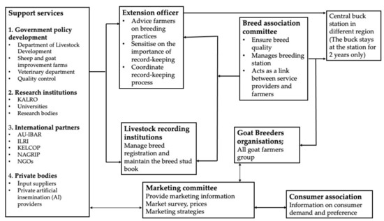 The formation of breed associations or farmer organizations has played a bigger role in ensuring the smooth running of buck stations. For example, the formation of community-based and farmer-led goat improvement programs in the Nyeri and Meru regions of Kenya has proven a notable success. These programs, under the facilitation of non-governmental organizations (GTZ) and the Integrated Small Livestock Project (ISLP) in Nyeri and FARM-Africa in Meru, have helped the formation of the Dairy Goat Association of Kenya (DGAK) and the Meru Goat Breeders Association (MGBA), respectively. The same model was also initiated by the Farm Africa Goat Improvement Project (FA-GP) in Tanzania. These initiatives have been so effective that, within less than seven years, there has been an improvement in the dairy goat population. Additionally, through these associations, farmers have increasingly adopted record-keeping for individual animals and are using these records to decide the market price for their breeding animals [71,72,73]. The above method can also be adopted for the conservation of indigenous goats in East Africa. Figure 5 shows a proposed framework that can be adopted to safeguard the indigenous goats of East Africa.