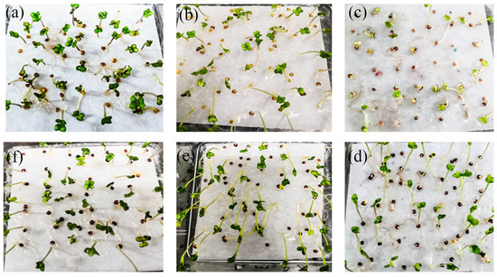 Seed germination at different heavy metal concentrations (50 seeds at each concentration). (a): F335 seed germination at 10× heavy metal concentration; (b): F335 seed germination at 50× heavy metal concentration; (c): F335 seed germination at 100× heavy metal concentration; (d): F338 seed germination at 10× heavy metal concentration; (e): F338 seed germination at 50× heavy metal concentration; (f): F338 seed germination at 100× heavy metal concentration.