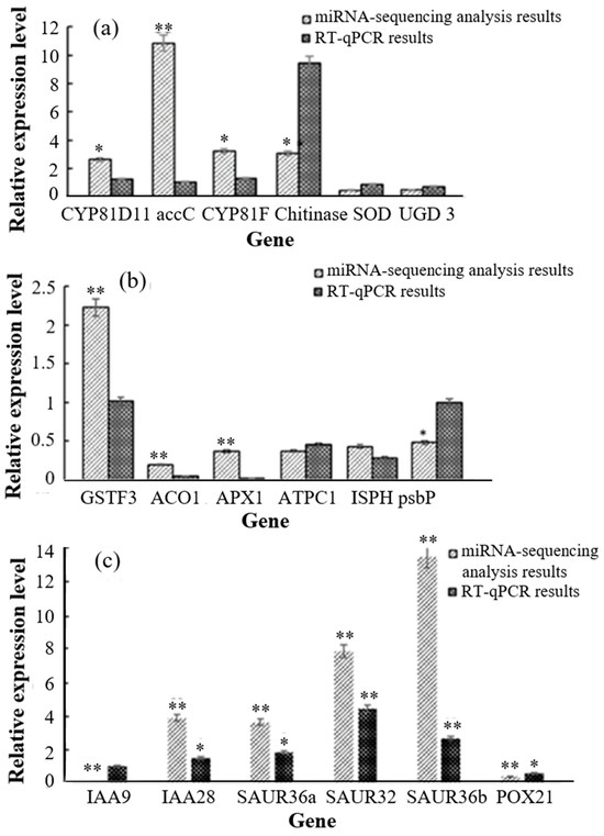 Six DEGs were selected and used to verify the results of the transcriptome analysis via RT-qPCR. The results were consistent with the transcriptomics data (Figure 4a), indicating that the transcriptome analysis results were reliable.