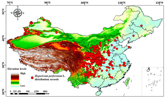 Geographical distribution of H. perforatum in China. Note: Red points represent species distribution records.