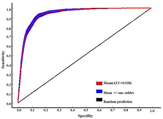 The accuracy of the MaxEnt model was verified using the Receiver Operator Characteristic (ROC), which was expressed as the area under the curve (AUC). AUC is a comprehensive evaluation criterion that reflects both the accuracy and specificity of the ROC curve. The range of AUC values is 0–1, with values closer to 1 indicating higher precision of the model’s predictive results. AUC values in the range of 0.1–0.6 represent a failure in the model’s predictive results, 0.6–0.7 indicate poor predictive effects, 0.7–0.8 indicate average predictive results, 0.8–0.9 represent good predictive results, and 0.9–1.0 indicate excellent predictive effects [33].