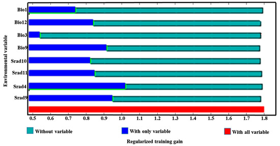 Table 1 shows among the solar radiation of the 12 months, the April solar radiation (Srad4) and September solar radiation (Srad9) have the greatest impact on the distribution of H. perforatum, with a combined contribution rate reaching 44.10% and a combined sum of permutation importance of 15.50%. Compared to April and September solar radiation, the November solar radiation (Srad11) and October solar radiation (Srad10) have a smaller impact on the distribution of H. perforatum, with contribution rates of 13.20% and 9.70%, respectively, and permutation importance of 10.40% and 5.60%, respectively. Among the 19 climate factors, the mean temperature of the driest quarter (Bio9), the annual mean temperature (Bio1), isothermality (Bio3), and annual precipitation (Bio12) have a larger influence on the suitable distribution of H. perforatum, with a combined contribution rate of 33.10% and a combined sum of permutation importance of 68.40%. According to the jackknife test results, as shown in Figure 3, the weights of April solar radiation (Srad4), September solar radiation (Srad9), the mean temperature of the driest quarter (Bio9), and annual precipitation (Bio12) are relatively high.