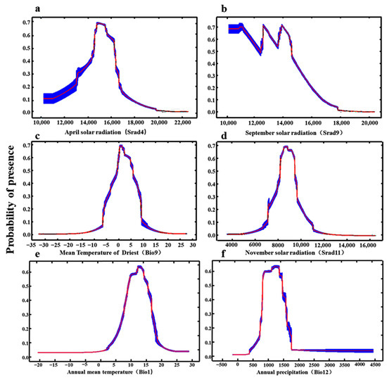 Singlefactor response curve of the current existence probability to the bioclimatic variables. (a) April solar radiation; (b) September solar radiation; (c) Mean Temperature of Driest; (d) November solar radiation; (e) Annual mean temperature; (f) Annual precipitation.