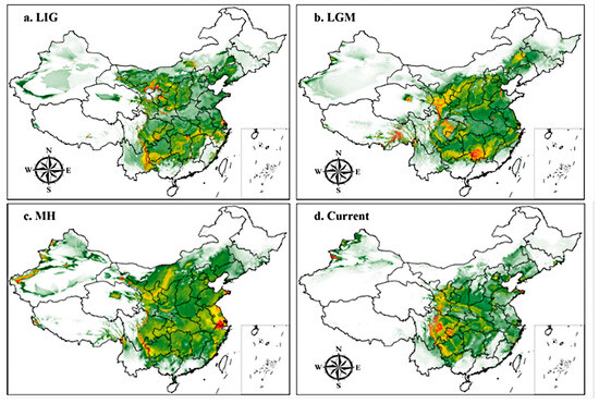 Potential distribution for H. perforatum in China under past and current climate conditions predicted by the MaxEnt model. The potential distribution of H. perforatum was divided into four grades by the natural breaks method. Red, yellow, green, and white areas represent highly suitable, moderately suitable, marginally suitable, and not suitable areas, respectively. (a) LIG; (b) LGM; (c) MH; (d) Current.