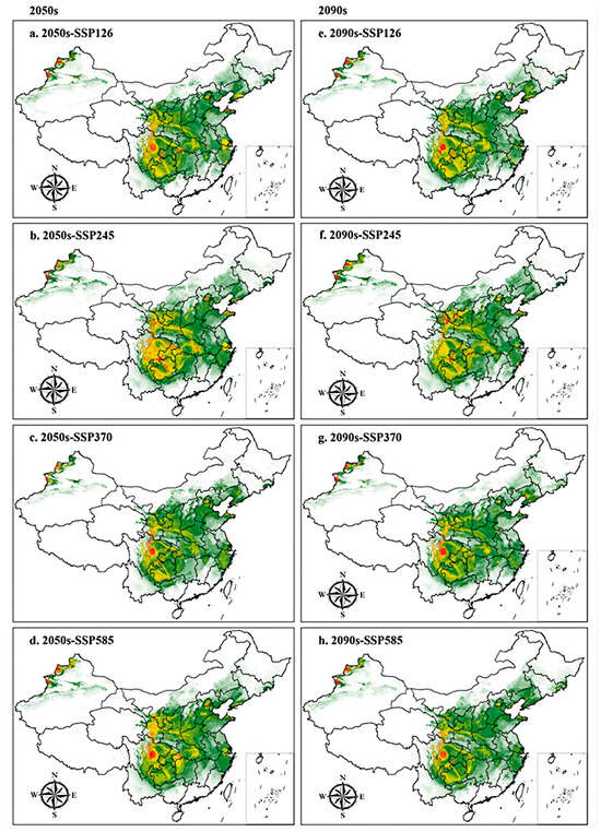 Potential distribution for H. perforatum in China under future climate conditions predicted by the MaxEnt model. The potential distribution of H. perforatum was divided into four grades by the natural breaks method. Red, yellow, green, and white areas represent highly suitable, moderately suitable, marginally suitable, and not suitable areas, respectively.(a) 2050s-SSP126; (b) 2050s-SSP245; (c) 2050s-SSP370; (d) 2050s-SSP585; (e) 2090s-SSP126; (f) 2090s-SSP245; (g) 2090s-SSP370; (h) 2090s-SSP585.
