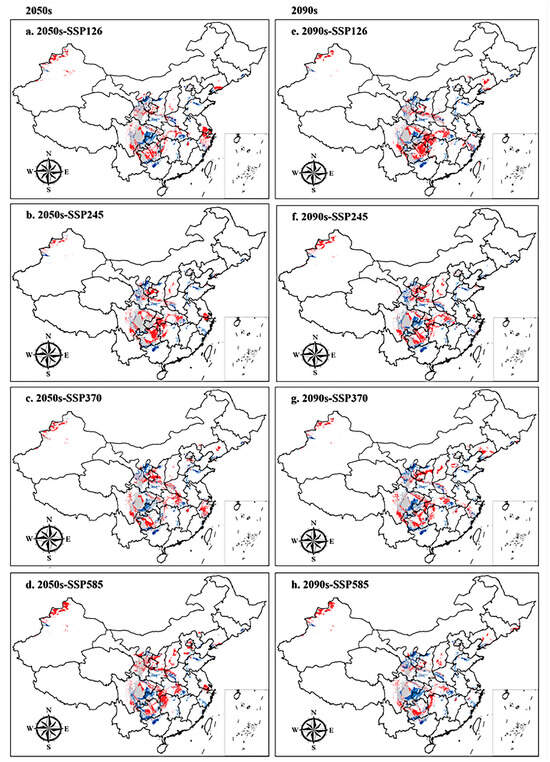 Spatial changes in H. perforatum in China under emission scenarios of the 2050s and 2090s. White, grey, red, and blue areas represent not suitable, unchanged suitable, expansion suitable, and contraction suitable areas, respectively. (a–d), the 2050s; (e–h), the 2090s; (a,e), future climate scenario SSP126; (b,f), future climate scenario SSP245; (c,g), future climate scenario SSP370; (d,h), future climate scenario SSP585.