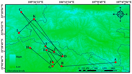 Migration of the center of suitable habitat for H. perforatum migratory routes in historical and future climate scenarios. Arrows indicate migratory routes and direction of the suitable habitat distribution center under historical and future climate scenarios. Among them, the meaning of the letters are as follows: (A) LIG; (B) LGM; (C) MH; (D) current; (E) 2050s-SSP126; (F) 2090s-SSP126; (G) 2050s-SSP245; (H) 2090s-SSP245; (I) 2050s-SSP370; (J) 2090s-SSP370; (K) 2050s-SSP585; (L) 2090s-SSP585.