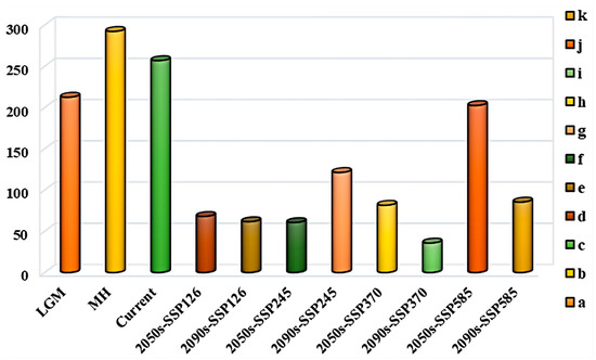 Figure 5 and Table 2 show under past climate scenarios, the high and medium suitability areas for H. perforatum changed significantly. The low-suitability areas were mainly distributed in regions such as Shaanxi Province, Shanxi Province, Henan Province, Hubei Province, and Anhui Province. Table 3 shows that compared to the present, the total suitable area for H. perforatum under past climate conditions was significantly larger than that under contemporary climate conditions. The total suitable area and the area of high suitability have shown a decreasing trend from the LIG to the present. The total suitable area and the high suitability area reached their maximum during the LIG at 309.18 × 104 km2 and 104.82 × 104 km2, respectively. Compared to the present, the total suitable area increased by 121.07 × 104 km2, and the high suitability area increased by 73.20 × 104 km2. The area of medium suitability first increased and then decreased, reaching its maximum during the LGM at 108.13 × 104 km2, an increase of 50.15 × 104 km2 compared to the present. The area of low suitability first decreased and then increased, reaching its maximum value during the LIG at 111.53 × 104 km2, an increase of 13.02 × 104 km2 compared to the low suitability area under the current climate scenario.