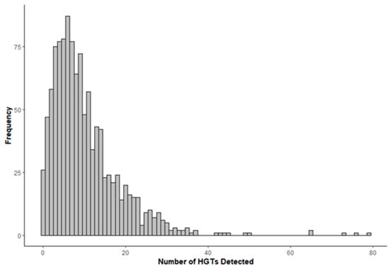 In the preliminary analysis for potential horizontal gene transfer cases, we analyzed 1137 proteomes from the Pezizomycotina subphylum using a database containing a low proportion of eukaryotic sequences, resulting in 15,242 identified HGT candidates (see Table S1). Following a validation step, we identified 14 proteomes with an unusually high proportion of HGT candidates. Upon examining their respective genomes, we identified contigs containing bacterial genetic material but no traces of fungal information. Suspecting potential contamination in the sequencing project, we omitted this data from further analysis. After excluding these proteomes, we found 11,227 remaining HGT candidates. Our analysis indicated that the average number of observed HGTs per proteome is approximately 10 ± 8, with approximately 98% of the examined organisms having fewer than 30 HGT candidates (Figure 1).