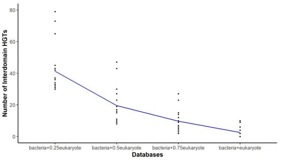In recent years, there has been a lot of research on interdomain HGT, suggesting that this is a common phenomenon in the evolution of eukaryotes. However, it might be less common than currently depicted in the literature [5]. Assessing the impact of HGT in eukaryotes is challenging due to gaps in genome information and the incomplete collection of available eukaryotic genomes. Moreover, existing methods for detecting HGT have limitations. Although previous studies have identified biases in HGT detection [5,6,7], little attention has been paid to the effect of database composition. Salzberg et al. [18] highlighted how database composition can lead to an overestimation of potential HGT candidates in early human genome drafts. The consequence of this phenomenon is simple to predict—when a database contains fewer homologs for an HGT candidate, it becomes challenging to identify their vertical transmission history, leading to a false impression of lateral transfer.