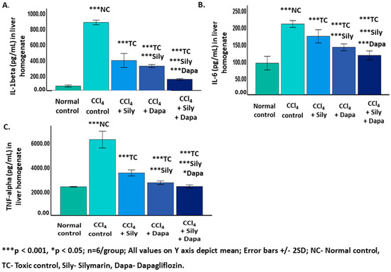 CCl4-induced hepatotoxicity is characterized by elevated pro-inflammatory cytokines [32]. Oxidative stress can elevate levels of inflammatory cytokines. Reactive oxygen species (ROS) generated during oxidative stress can activate nuclear factor kappa B (NF-κB), a key transcription factor that promotes the expression of various pro-inflammatory cytokines such as tumor necrosis factor-alpha (TNF-α), interleukin-1 beta (IL-1β), and interleukin-6 (IL-6). This link between oxidative stress and inflammation underscores the intricate interplay between oxidative damage and the immune response, contributing to the pathogenesis of various diseases [33]. Dapagliflozin exhibited a significant reduction in IL-1 beta, IL-6, and TNF-alpha, aligning with studies emphasizing its anti-inflammatory effects [34,35,36]. The combination of dapagliflozin and silymarin displayed a robust suppression of inflammatory biomarkers, indicating a potential synergistic effect.