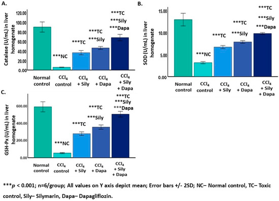 Hepatotoxicity was induced by administering 1:1 mixture of CCl4 and olive oil; (1.59 mg/kg and 0.92 mg/kg, respectively, ~1 mL/kg; i.p. every 48 h) [11,12,14]. We have earlier reported the hepatoprotective dose of silymarin as 50 mg/kg/day for Wistar rats [7,9,11,12,13,14]. The US FDA-approved dose for the antidiabetic effect of dapagliflozin in humans is 10 mg/day. According to Paget and Barnes’ body surface area ratio, the human dose was converted to the rat dose equivalent of 0.9 mg/kg/day. Silymarin and dapagliflozin were each dissolved in 2% gum acacia and administered orally.