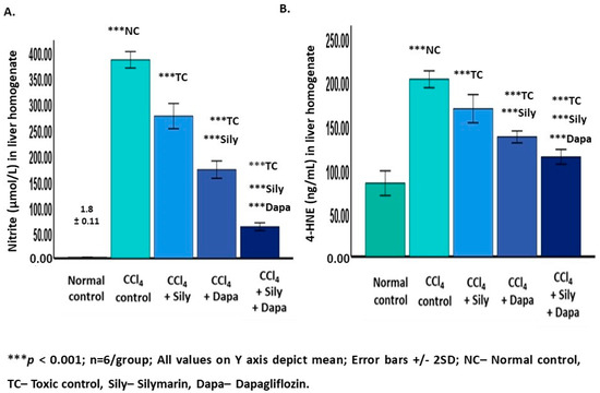 The active pharmaceutical ingredient of silymarin was sourced from Sigma-Aldrich-Merck Limited, Bangalore, India. Dapagliflozin was acquired from AstraZeneca. Colorimetric assay kits for ALT, AST, and total bilirubin were obtained from Alliance Global, Dubai, United Arab Emirates. Fasting blood glucose glucometer strips were purchased from Life Pharmacy, Dubai, United Arab Emirates. Colorimetric assay kits for glutathione peroxidase, catalase, SOD, nitrites, and rat ELISA kits for 4-HNE, IL-1β, IL-6, TNF-α, Nrf2, and HO-1 were procured from Elabscience, United States through the Scientechnic, a distributor based in the UAE. All laboratory-grade chemicals including carbon tetrachloride were obtained through local distributors in the UAE.
