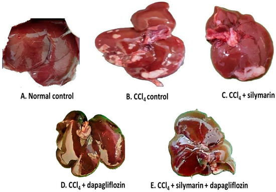 Upon gross examination of the liver, we observed that the normal healthy control group exhibited a dark reddish-brown liver with a soft, smooth, and shiny surface, whereas, CCl4-induced hepatotoxic control rats showed a slight pale color of the liver along with multiple yellowish-white patches indicating fatty infiltration over the surface. Silymarin alone-treated hepatotoxic rats displayed comparatively fewer yellowish-white patches than the hepatotoxic control group. Surprisingly, hepatotoxic rats treated with dapagliflozin alone, as well as in combination with silymarin, demonstrated normal liver morphology, similar to that of the normal control group (Figure 6).