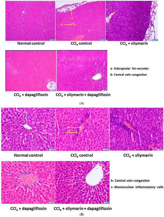 The normal healthy control group displayed a typical hepatocellular structure, with hepatocytes arranged in hepatic cords concentrically around the central vein. In contrast, the CCl4-induced hepatotoxic control group exhibited subcapsular fat vacuoles, a dilated and congested central vein, and moderate perivenular and periportal infiltration of mononuclear cells, mainly macrophages and lymphocytes. Silymarin alone-treated hepatotoxic rats showed mildly dilated central veins, mild to moderate perivenular mononuclear cell infiltration, and subcapsular fat vacuoles. Dapagliflozin alone-treated hepatotoxic rats demonstrated infiltration of a few mononuclear inflammatory cells around the central vein, along with significant restoration of hepatocyte architecture. Hepatotoxic rats treated with a combination of dapagliflozin and silymarin had a hepatocellular architecture closely resembling that of the normal control group (Figure 7A,B).