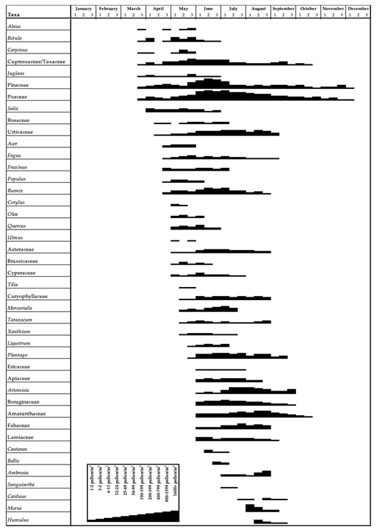 In the study conducted using the volumetric method, a Hirst-type volumetric pollen trap (Lanzoni VPPS 2010) was employed. The pollen trap was positioned on the roof of a building approximately 15 m high in the center of Sarıkamış, and samples were collected between 1 January 2012, and 31 December 2013. Weekly samples were brought to the laboratory and converted into daily preparations by dividing them into 7 equal parts of 48 mm The daily and hourly average concentration of the number of pollen grains was defined by hourly counting at 400× magnification under a Leica light microscope at intervals of 2 mm (representing 1 h), and their abundance in 1 m3 of air was measured following the methodology recommended by the REA (Spanish Aerobiological Network) [16]. Daily variations and the main pollen seasons were determined using Andersen’s method [17]. The start of the Main Pollen Season (MPS) was defined as the day when the daily pollen count reached 2.5% of the annual pollen index (API), and it ended when 97.5% of the annual pollen count was reached. Threshold values for daily pollen concentrations in the air affecting sensitive individuals were calculated according to the REA standards [16]. A pollen calendar was constructed using the Spieksma model [18]; daily pollen counts from 10-day periods over the study years were summed and averaged to prepare the pollen calendar for Sarıkamış (Figure 2). Average pollen counts were correlated with parameters such as temperature, wind speed, relative humidity, and total precipitation obtained from the Turkish Meteorological Directorate (40°19′58″ N–42°35′53″ E). The relationship between meteorological factors and pollen counts was evaluated using Spearman’s correlation test in SPSS 20.