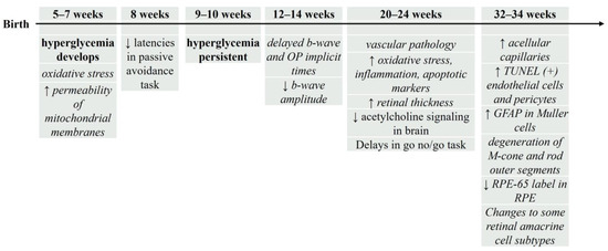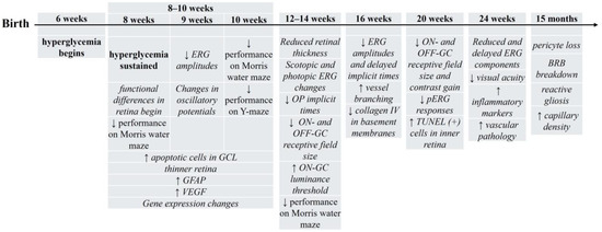 Zucker Diabetic Fatty (ZDF) rats have a mutation in the leptin (fa/fa) gene causing them to gain weight and develop insulin resistance [36], making them a model of non-insulin dependent diabetes with obesity [111,112]. ZDF rats begin to develop hyperglycemia at 5–7 weeks of age (Figure 3), with significant and sustained hyperglycemia after 9–10 weeks [19,33,113,114]. A recent study [19] examined progressive changes in ZDF retinas by comparing 6-week-old (prediabetic), 12-week-old (moderate lipidemia, severe hyperglycemia), and 20–40-week-old (severe lipidemia and hyperglycemia) tissues. Their findings indicate a progression of complications beginning with early oxidative stress and changes to the permeability of mitochondrial membranes (6 weeks) followed by reduced ERG b-wave amplitudes (12 weeks) and subsequent vascular differences (20 weeks). Importantly, a difference from controls, once identified, persisted with age.