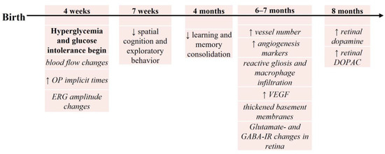 Goto-Kakizaki (GK) rats also spontaneously develop T2DM [103]; however, these animals are non-obese with stable, moderate hyperglycemia [104,105,106]. At 1 month (4 weeks) of age, when hyperglycemia onset and glucose intolerance occur, retina perfusion shows a prolonged mean circulation time and a decrease in segmental blood flow [106], though acellular capillaries are not evident [95]. However, there are functional delays in flicker response and OP implicit times at this age [95,107]. Some reports also indicate deficits in ERG a-wave, b-wave, and OP amplitudes [34] at 1 month; while others report an increase in ERG amplitudes [95,107]. Between 6 and 7 months, vessel number and expression of angiogenic markers increase, suggesting neovascularization [108]. Additionally, there are signs of reactive gliosis, macrophage infiltration, upregulation of VEGF, and thickening of basement membranes [109] without a change in retinal thickness [106,110]. Shifts in glutamate- and GABA-immunoreactivity patterns occur at 28 weeks (~7 months) of age [110] and an increase in overall dopamine content [95] is apparent at 8 months (Figure 2), both potentially contributing to the observed physiological changes.