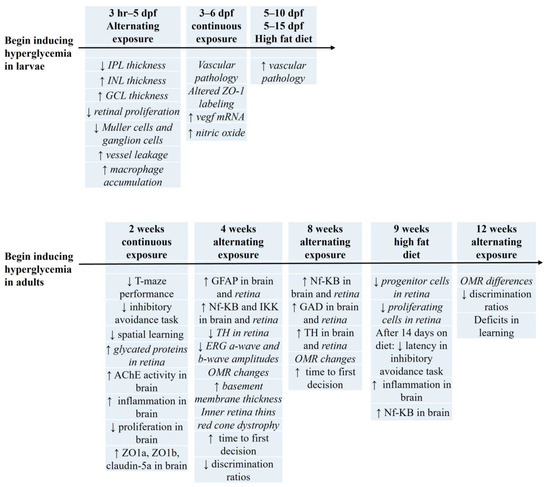 Overall, T2DM zebrafish models display similar characteristics to rodents. Inflammation, functional deficits, and vascular changes are all evident. Glucose-induced changes in zebrafish retina occur after 2 weeks (continued exposure) or 4 weeks (alternating exposure) of treatment. Adults that are alternately exposed to glucose for 4 weeks show functional and vascular changes, similar to the morphological and vascular changes noted in larvae. These results suggest a different onset of complications in zebrafish compared to rodent retinas.