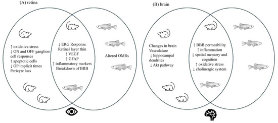 Prolonged hyperglycemia, characteristic of individuals with T2DM, deleteriously affects both retina and brain, leading to vision and cognitive deficits. Common pathologies observed in both tissues across rodent and zebrafish models (Figure 6) include increased inflammation and vascular changes, which are hypothesized to then impact neuronal function. However, in rodent (i.e., db/db mouse, GK rat, and ZDF rat) retinas, neuroinflammation and oxidative stress occur first, before vascular differences. Determining the precise timing of these outcomes in the brain has proved more challenging. Functional deficits in retina are typically measured physiologically, while cognitive function is determined behaviorally. This latter difference could make the identification of disease progression difficult as behavioral effects may take longer to appear. This concern could be eliminated by using the same animal model to study both hyperglycemia-associated retinopathy and cognitive decline, as it would determine if changes occur in parallel or if changes in one tissue precede changes in the other. Indeed, the consistently observed differences in vascular pathology and neuroinflammation between the retina and the brain, together with functional differences, suggest that hyperglycemia-induced retinal changes, which are more easily observed, could serve as an indicator of corresponding changes in the brain [13,165].