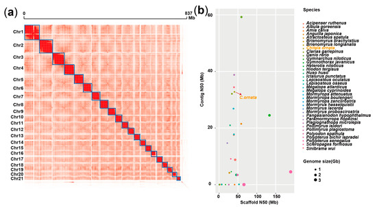 Chromosome-level genome assemblies of C. ornata. (a) The interaction map of Hi-C data. (b) Genomic quality statistics of the Osteoglossiformes.