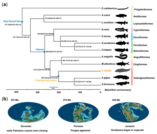 We constructed phylogenetic relationships using comprehensive genome-wide comparison data from 12 species, including C. ornata (as well as Erpetoichthys calabaricus, Amia calva, Lepisosteus oculatus, Scleropages formosus, Esox lucius, Arapaima gigas, Anguilla anguilla, Oryzias latipes, Danio rerio, Megalops atlanticus, and Gasterosteus aculeatus). Furthermore, our analysis confirms that Osteoglossomorpha and Elopomorpha constitute sister groups to Clupeocephala (Figure 2a), consistent with previous research [1]. By integrating differentiation time analysis, we determined that teleost fishes originated around the Permian period (~269 million years ago), while the divergence of Osteoglossiformes took place during the Jurassic (~203 million years ago). Previous studies have shown that plate drift affects speciation to some extent. For example, continental drift has led to the speciation of mammals [33,35]. The combination of our data and paleogeological data suggests that plate movement may be associated with the occurrence of teleost fishes (Figure 2b). Therefore, by using genome-wide data analysis, we determined the evolutionary history of Osteoglossiformes, which provides more references for understanding the evolutionary history of early teleost fishes.