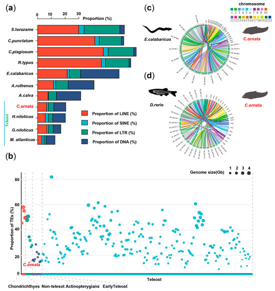 TEs and synteny analysis across multiple species. (a) Comparative analysis of TE composition in different fishes. (b) Total proportion and genomic characterization of TEs in 235 fishes. (c) Genome synteny of the Reedfish–Clown featherback. (d) Genome synteny of Zebrafish–Clown featherback.