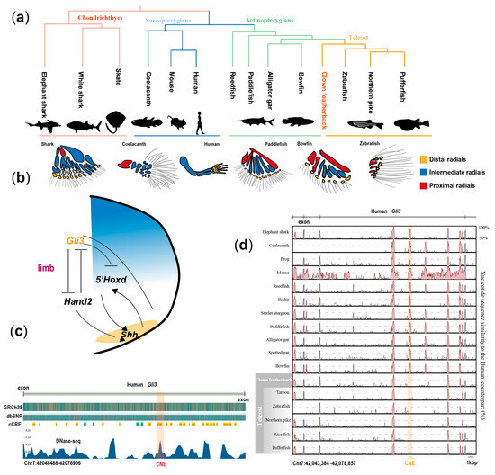 Identification of conserved elements of the pectoral fin. (a) Hypothetical transitions in pectoral fin evolution. (b) Diagram of Gli3 contributing to limb development [51]. (c) VISTA plot showing the presence of a limb-related CNE intro of the Gli3 gene across all jawed vertebrates except the teleost. Peaks (blue, exons; red, non-coding regions) indicate regions with conserved sequences compared to their human counterparts. The Gli3-CNE is highlighted in pale yellow. (d) Human DNase I hypersensitivity site (DHS) data suggest CNE as a potential regulatory element (data from https://www.encodeproject.org/ and accessed on 1 April 2023).