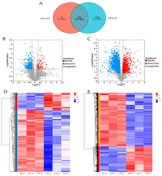 Proteomics analysis of the effects of CA and CP stress on proteins in the hepatopancreas of the F. chinensis: (A) Venn diagram of differentially expressed proteins (DEPs); (B) volcanic graph of DEPs in CA vs. CT group; (C) volcanic graph of DEPs in CP vs. CT group; (D) hierarchical cluster analysis of DEPs in CA vs. CT group; and (E) hierarchical cluster analysis of DEPs in CP vs. CT group. Red represents significantly upregulated proteins, blue represents significantly downregulated proteins, and gray indicates proteins with no significant difference in expression. The colors of the hierarchical cluster legend represent the relative expression of proteins within the group of samples.