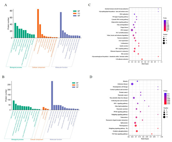 Functional enrichment analysis of DEPs: (A) GO analysis in CA vs. CT group; (B) GO analysis in CP vs. CT group. Green represents biological processes (BP); red represents cellular components (CC); and blue represents molecular functions (MF); (C) KEGG analysis in CA vs. CT group; and (D) KEGG analysis in CP vs. CT group.