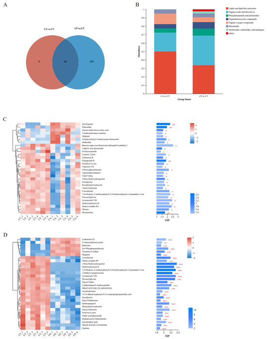 Metabolomic analysis of the effects of CA and CP stress on metabolites in the hepatopancreas of the F. chinensis: (A) Venn map; (B) stacked histogram of DEMs; (C) expression patterns and VIP values of metabolites analyzed in CA vs. CT group; and (D) expression patterns and VIP values of metabolites analyzed in the CP vs. CT group. Red indicates upregulation, and blue indicates downregulation. * p ≤ 0.05; ** p ≤ 0.01; *** p ≤ 0.001.
