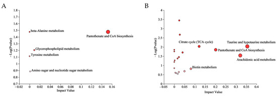 Significantly changed pathways based on the enrichment and topology analyses: (A) KEGG analysis in CA vs. CT group; and (B) KEGG analysis in the CP vs. CT group. The color of the bubbles indicates the significance of metabolite enrichment in the pathway; the size of the bubbles represents the impact value; the larger the bubble, the greater the importance of the pathway.