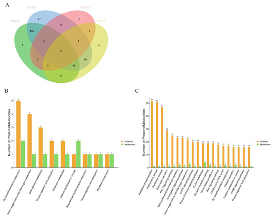 Combined analysis of KEGG pathways for DEPs and DEMs: (A) interactive Venn diagram of DEPs and DEMs; (B) KEGG pathway involving DEPs and DEMs together under CA exposure; and (C) KEGG pathway involving DEPs and DEMs together under CP exposure.