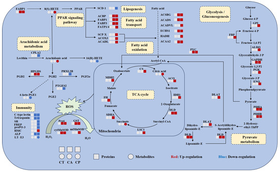 Combined proteomic and metabolomic analysis of hepatopancreas of F. chinensis after CA and CP stress. Circles represent metabolites and squares represent metabolites. The blue color represents downregulation and the red color represents upregulation. Solid and dashed arrows represent direct and indirect effects, respectively. FABP1, fatty acid binding protein; PPAR, peroxisome proliferator-activated receptors; scd-1, stearoyl-CoA desaturase 5-like; ACBP, acyl-CoA-binding protein; FABP3, sodium/calcium exchanger regulatory protein 1-like; FATP1/4, long-chain fatty acid transport protein 4-like; SCP-X, non-specific lipid-transfer protein, partial; ACOX3, acyl-coenzyme A oxidase 3, peroxisomal-like isoform X1; ACADL, long-chain specific acyl-CoA dehydrogenase; ACSBG, putative very-long-chain-fatty-acid—CoA ligase bubblegum isoform X2; ACADS, short-chain specific acyl-CoA dehydrogenase; ACADVL, very-long-chain specific acyl-CoA dehydrogenase; ECHS1, enoyl-CoA hydratase; HADH, hydroxyacyl-coenzyme A dehydrogenase; ACAA2, 3-ketoacyl-CoA thiolase; GPI, glucose-6-phosphate isomerase-like; FBP, fructose-1,6-bisphosphatase 1-like isoform X1; ALDO, fructose 1,6-biphosphate-aldolase A; GAPDH, glyceraldehyde-3-phosphate dehydrogenase isoform X1; PGK, phosphoglycerate kinase; ENO, phosphopyruvate hydratase; PDHA, probable pyruvate dehydrogenase E1 component subunit alpha; PDHB, pyruvate dehydrogenase E1 component subunit beta; DLD, dihydrolipoyl dehydrogenase; DLAT, dihydrolipoyllysine-residue acetyltransferase component of pyruvate dehydrogenase complex; PYC, pyruvate carboxylase; CS, probable citrate synthase 1; ACO, aconitate hydratase; IDH1, isocitrate dehydrogenase; LSC1, succinate—CoA ligase subunit alpha; SDHA, succinate dehydrogenase [ubiquinone] flavoprotein subunit; FH, fumarate hydratase; MDH2, malate dehydrogenase; CPLA2, cytosolic phospholipase A2-like isoform X2; HPGDS, hematopoietic prostaglandin D synthase; PRXL2B, prostamide/prostaglandin F synthase-like; PTGES2, prostaglandin E synthase 2; SR, scavenger receptor; FREP, fibrinogen-related protein; ProPO-3, prophenoloxidase-3; HMC, hemocyanin; ALP, alkaline phosphatase; T-E3, leukotriene E3; Prx6, peroxiredoxins; GST, glutathione S-transferase; cytMnSOD, cytoplasmic manganese superoxide dismutase; mtMnSOD, mitochondrial manganese superoxide dismutase.