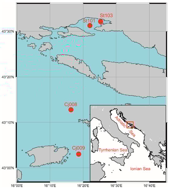 Phytoplankton samples were collected monthly at four stations in the central Adriatic Sea (Figure 1), providing a comprehensive 14-year-long dataset (2007–2020) of abundance and taxonomic composition. Sampling was carried with research vessels Bios (2007–2009) and Bios Dva (2010–2020), using the consistent methodology. Stations ST101 (depth 30 m) and ST103 (depth 17 m) are located in semi-enclosed Kaštela Bay, which was, prior to the installation of a wastewater collector in 2004, under considerable anthropogenic influence, but has since experienced a gradual transition towards oligotrophy [7,18]. The other two stations (CJ008 and CJ009) are located in the offshore central Adriatic along the transect towards the western Adriatic coast (Split–Monte Gargano), with depths of 75 m and 100 m, respectively (Figure 1).