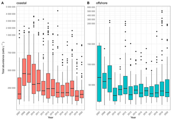 The overall phytoplankton abundance showed a slight decline at the offshore stations and a more noticeable decline at the coastal stations from 2007 to 2020 (Figure 2). The total abundance in the coastal stations was around one order of magnitude higher (median 3.92 × 105 cellsL−1, range 6.56 × 103–4.44 × 106 cellsL−1) as compared to that in the offshore stations (median 4.07 × 104 cellsL−1, range 370–5.11 × 105 cellsL−1).