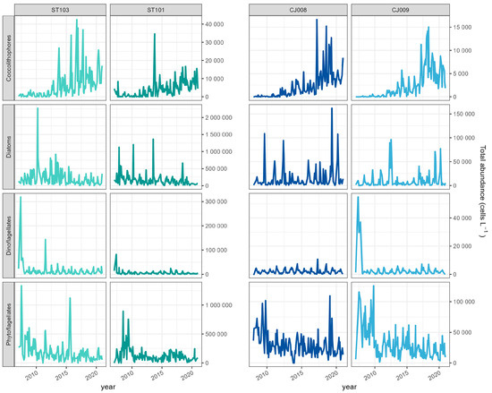Abundance of major phytoplankton groups at coastal ST101, ST103 (left panel); and offshore stations CJ008, CJ009 (right panel) in the period 2007–2020.