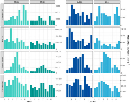 Monthly distribution of median abundances of major phytoplankton groups (including all depths) at coastal ST101, ST103; (left panel) and offshore CJ008, CJ009 (right panel) in the period 2007–2020.
