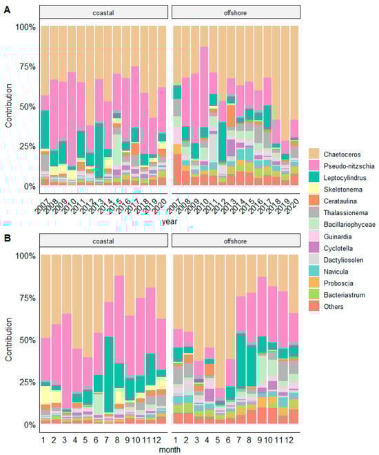 Relative contribution of diatom genera to all diatoms at coastal and offshore stations from a long-term (A) and seasonal perspective (B).