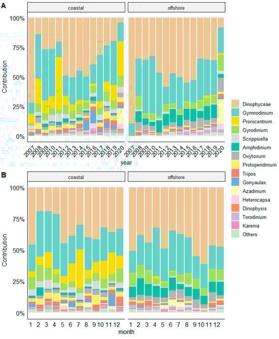Relative contribution of dinoflagellate genera to all dinoflagellates at coastal and offshore stations from a long-term (A) and seasonal perspective (B).