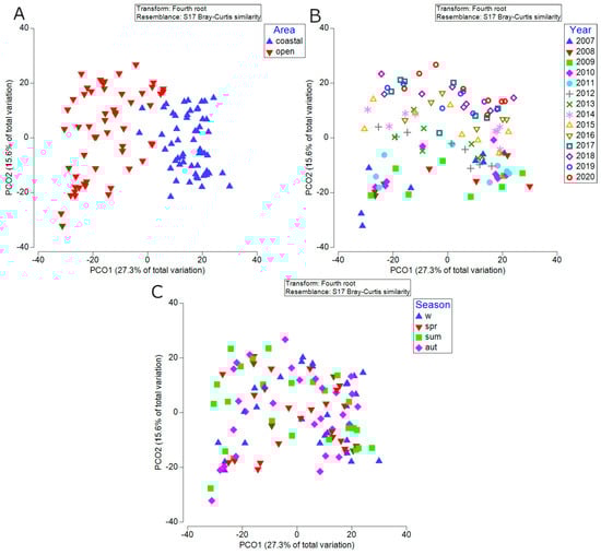 PCO biplots of samples based on the entire surface dataset of four investigated stations presenting different factors (A) area (B) year (C) season. Data were averaged using combined factor area–year–season.