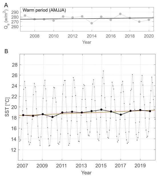 (A) Mean values of incoming short-wave radiation (Qs) from ERA5 analysis for the latitude 43.0 N and longitude 16.5 E for warmer part of the year (April–August) during 2007–2020. (B) Sea surface temperature (SST) at latitude 43.0 N and longitude 16.5 E for monthly means (gray dotted line), annual mean (black dots and line) with linear trend (orange line) during 2007–2020.